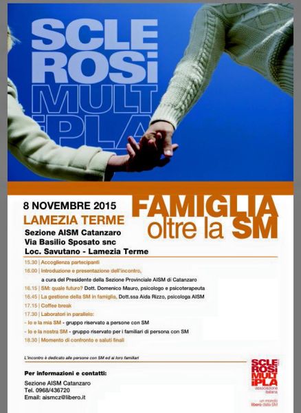 LAMEZIA TERME (CZ) – Si terrà domenica 8 novembre alle 15:30 presso la Sezione Aism di Catanzaro in via Basilio Sposato, località Savutano a Lamezia Terme, il convegno “Famiglie oltre la sclerosi”, un incontro rivolto alle persone con sclerosi multipla e alle loro famiglie.