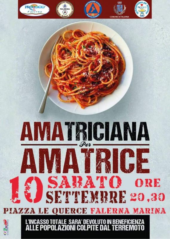 FALERNA (CATANZARO) – Un’iniziativa che colora di solidarietà il settembre calabrese, organizzata dalla dinamica Pro Loco di Falerna. Si tratta di “Un’amatriciana per Amatrice”, che avrà luogo sabato 10 settembre a Falerna Marina, in piazza delle Querce, a partire dalle 20:30. La manifestazione benefica si avvarrà della significativa collaborazione del Gruppo comunale di Protezione civile “A. Perri”. Significativa in virtù dell’importante missione che la Protezione Civile nazionale, insieme ai Dipartimenti regionali, sta conducendo in Italia centrale, nei luoghi danneggiati dal sisma.