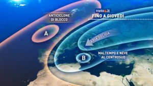 L’inverno resta intrappolato sull’Italia con una prosecuzione della fase di freddo e soprattutto di maltempo sull’Italia centro-meridionale. Situazione insistente causata da un anticiclone di blocco posizionato sull’Europa occidentale e proteso fin verso la Scandinavia, che impedisce l’arrivo sull’Italia di perturbazioni atlantiche e in grado di indirizzare correnti gelide orientali verso la depressione che insiste al Centro-Sud Italia.