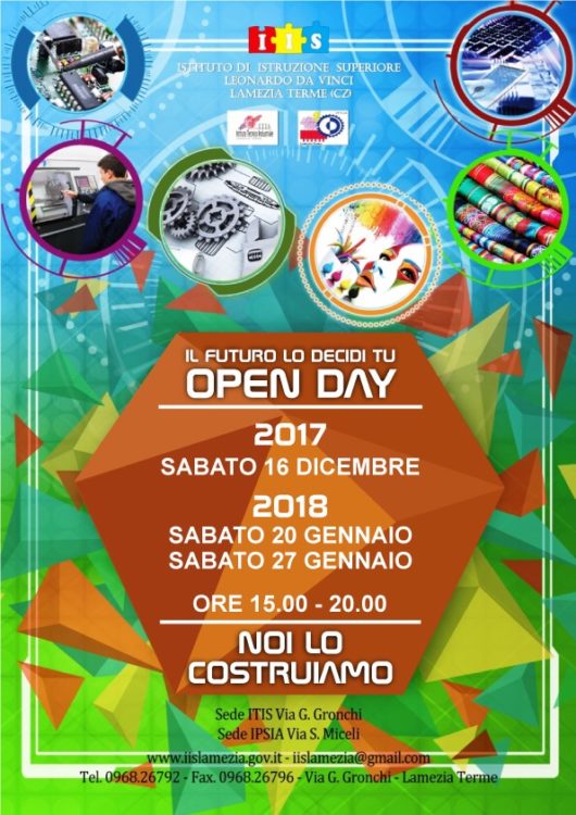 LAMEZIA TERME (CATANZARO) – L’IIS “LEONARDO DA VINCI” anche nelle giornate di sabato 20 e sabato 27 gennaio, dalle ore 15:00 alle ore 20:00, sarà aperto per consentire a tutti i ragazzi delle terze medie con le loro famiglie di visitare la scuola e, soprattutto, i laboratori dove si svolgono le ore delle materie professionali che caratterizzano l’Istituto.