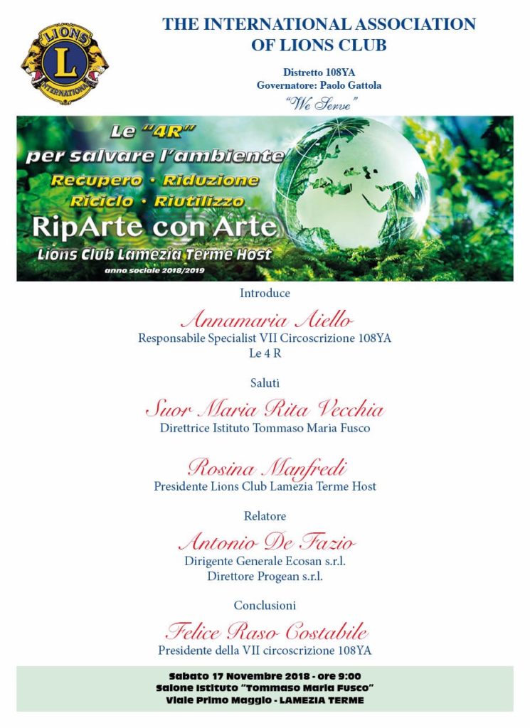Dall’urgenza-emergenza di rieducare al rispetto della natura, e dalla necessità di impegnarsi nell’ambito dell’educazione ambientale, che nasce il progetto “Le 4 R – Riduzione, Recupero, Riciclo e Riutilizzo”, il cui coordinamento è stato affidato a Sergio Esposito, Specialist Distrettuale 108YA (Lions Club Battipaglia-Eboli).