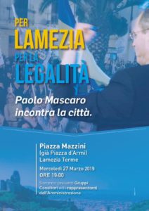 LAMEZIA TERME (CATANZARO) – A causa delle avverse condizioni meteorologiche, l’incontro dell’avv. Paolo Mascaro, “Per Lamezia – Per la legalità” previsto per questa sera, mercoledì 27, è rinviato a venerdì 29 marzo, alle ore 19 presso piazza Mazzini.