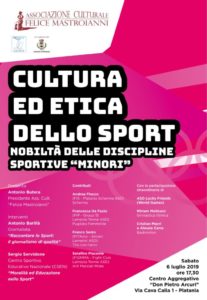 PLATANIA (CATANZARO) – L’Associazione Culturale “Felice Mastroianni”, in collaborazione con la Pro-Loco di Platania e con il patrocinio dell’Amministrazione comunale, organizza per Sabato 6 luglio, alle ore 17:30, presso il Centro Aggregativo “Don Pietro Arcuri” di Platania il Convegno“Cultura ed Etica dello Sport. Nobiltà delle Discipline Sportive “Minori”.