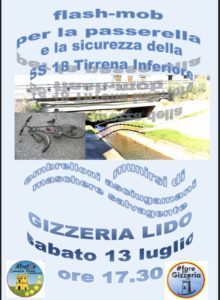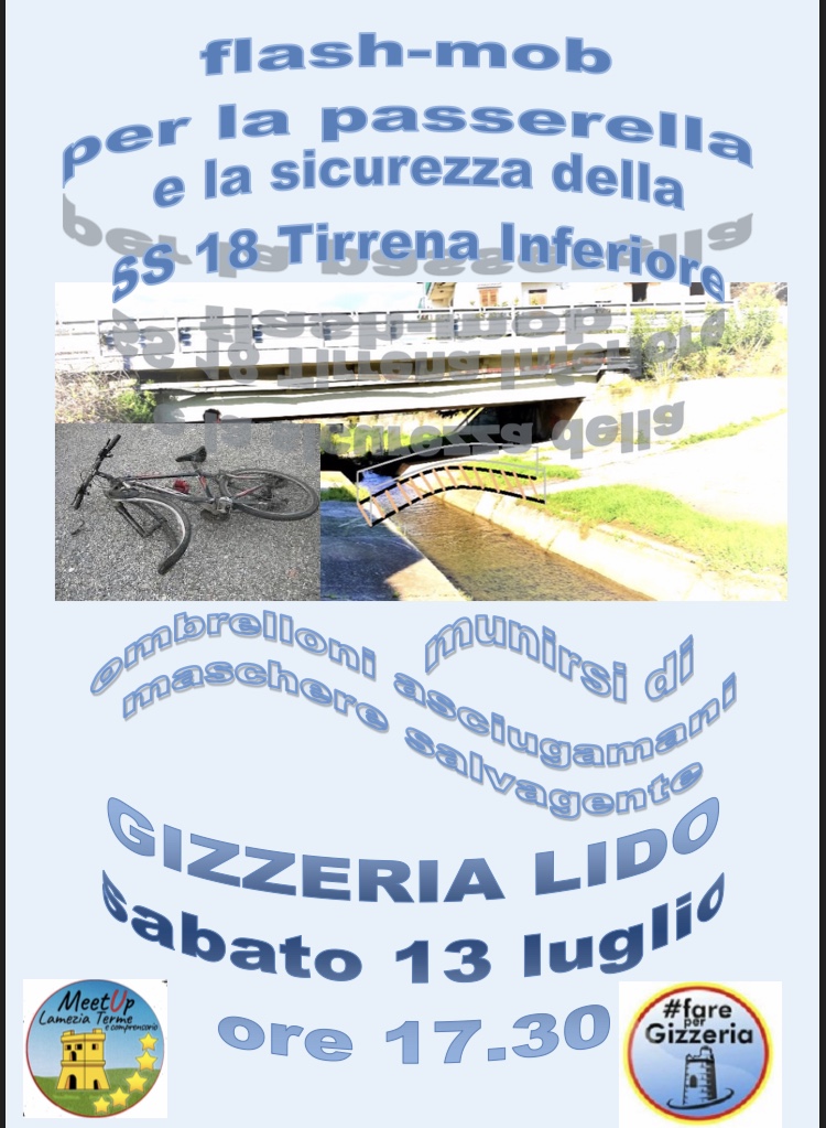 GIZZERIA LIDO (CATANZARO) – Sabato 13 luglio, alle ore 17.30, si terrà un flash-mob a Gizzeria Lido, sulla statale 18 Tirrena Inferiore in prossimità del ponte che collega il Comune di Gizzeria con quello di Lamezia Terme.
