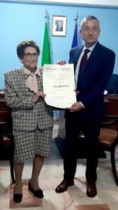 Per tale motivo, il prefetto di Vibo Valentia Francesco Zito, ha consegnato la pergamena attestante il conferimento dell’onorificenza di Cavaliere “Al Merito della Repubblica Italiana” all’ostetrica ora 90enne Anna Petruzza. L’onorificenza è stata conferita dal Presidente della Repubblica Sergio Mattarella in ragione delle sue particolari benemerenze, su proposta del presidente del Consiglio dei Ministri Giuseppe Conte, sentito il Consiglio dell’Ordine Al Merito della Repubblica Italiana. “Dai cittadini di Briatico viene descritta come una persona sempre disponibile e dedita al lavoro” è scritto ancora nella motivazione del riconoscimento.