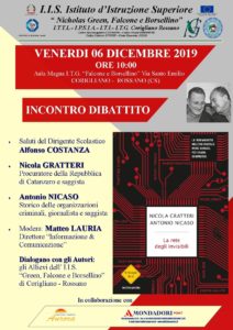 CORIGLIANO ROSSANO (COSENZA) – Evento di alto profilo all’Istituto d’Istruzione Superiore “Nicholas Green, Falcone e Borsellino” (I.T.T.L – I.P.S.I.A – I.T.I – I.T.G.) di Corigliano Rossano. In collaborazione con la MONDADORI POINT e la la LIBRERIA AURORA dell’area urbana Corigliano, l’ufficio di dirigenza scolastica presieduto da Alfonso Costanza ha organizzato un incontro – dibattito incentrato sui temi della criminalità organizzata.