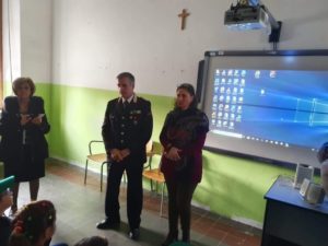 Alla presenza della Dirigente, e con l’aiuto di un interessante supporto video, il Maresciallo ha spiegato agli studenti le caratteristiche dell’Arma dei Carabinieri, le differenze tra i vari corpi speciali, le forze dispiegate sul territorio nazionale, l’organizzazione e la dislocazione di stazioni, comandi e giurisdizioni.  Con un linguaggio semplice ed efficace è riuscito ad attirare l’attenzione dei discenti su varie tematiche riguardanti la legalità che si concretizza attraverso leggi che vanno conosciute ed osservate per garantire l’ordine sociale.
