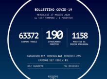 In Calabria ad oggi sono stati effettuati 63.372 tamponi. Le persone risultate positive al Coronavirus sono 1.158 (+1 rispetto a ieri), quelle negative sono 62.214.