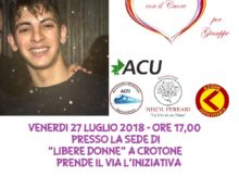 CROTONE – Venerdi 27 luglio alle ore 17, presso la sede “Libere Donne” di Crotone, verrà presentata l’iniziativa “Con il cuore…per Giuseppe”, nata dalla proposta lanciata dalla portavoce