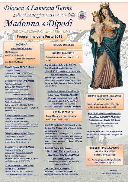 La festa del 15 agosto sarà preceduta da un triduo con momenti di preghiera e comunitari significativi che ogni anno rinsaldano il legame tra la Madonna di Dipodi e i suoi tanti devoti. Il 13 agosto alle 11 sul piazzale del Santuario si terrà la benedizione dei ciclisti. Alle 18.30 la processione della Madonna di Dipodi; da alcuni anni, la statua della Madonna viene portata in processione dagli statuari di S. Antonio di Padova, come segno di comunione tra i due santuari diocesani. Alle 18.30 la S. Messa presieduta dal vescovo emerito di Lamezia Terme Mons. Vincenzo Rimedio. Il 14 agosto, vigilia della festa, si rinnoverà il tradizionale pellegrinaggio a piedi da Nicastro a Dipodi: i fedeli delle varie parrocchie si ritroveranno alle 5 del mattino di fronte la Chiesa di Santa Maria Maggiore per iniziare il cammino di preghiera verso il Santuario, dove alle 7.30 sarà celebrata la S. Messa. Sempre il 14 agosto, alle 21, la S. Messa presieduta dal Vescovo Mons. Luigi Cantafora e animata dalla Corale Benedetto XVI; a seguire la veglia di preghiera, guidata da Don Gianluca Taverna, con i giovani di Pianopoli. Il 15 agosto, giorno della festa, saranno celebrate 7 messe nel corso della giornata che sarà conclusa con la celebrazione eucaristica delle 20.30 presieduta da Mons. Giuseppe Fiorini Morosini, Arcivescovo di Reggio Calabria – Bova.