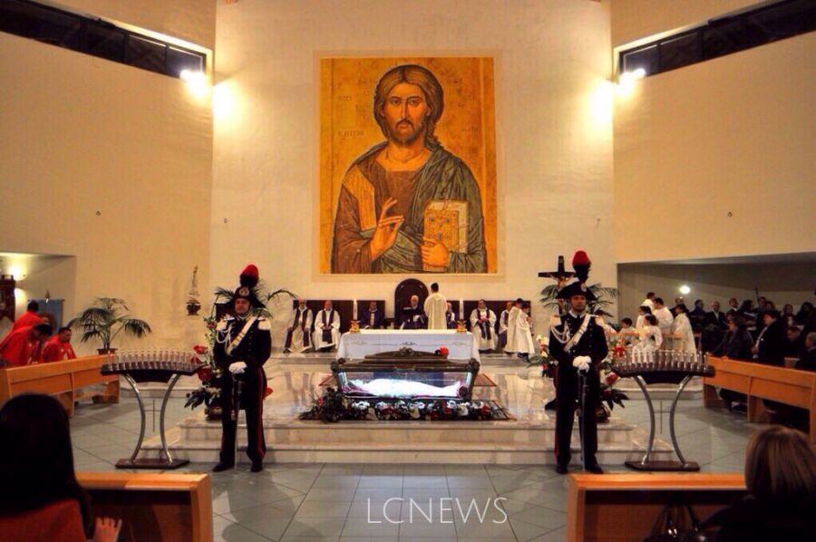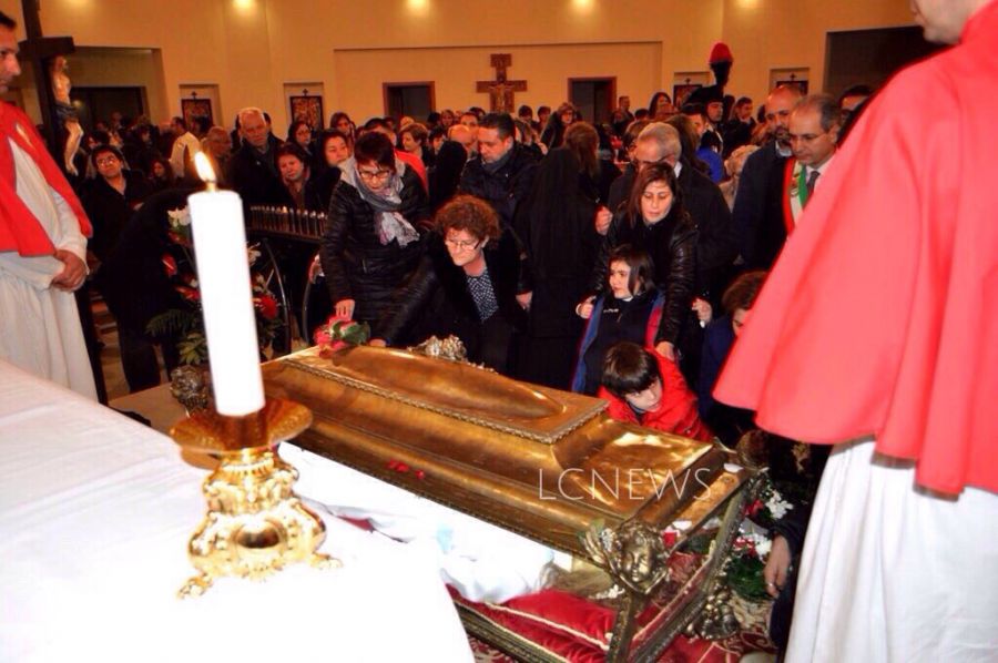 LAMEZIA TERME (CATANZARO) – Il Vescovo della Diocesi di Lamezia Terme Luigi Cantafora, il Parroco della Parrocchia del quartiere Savutano Don Pino Angotti e il Sindaco di Lamezia Terme Paolo Mascaro, nella serata del 15 febbraio 2016 hanno atteso tra le palazzine di località Prunia di Sambiase, l’arrivo del Corpo della Santa Maria Goretti, prima tappa del pellegrinaggio in Calabria.