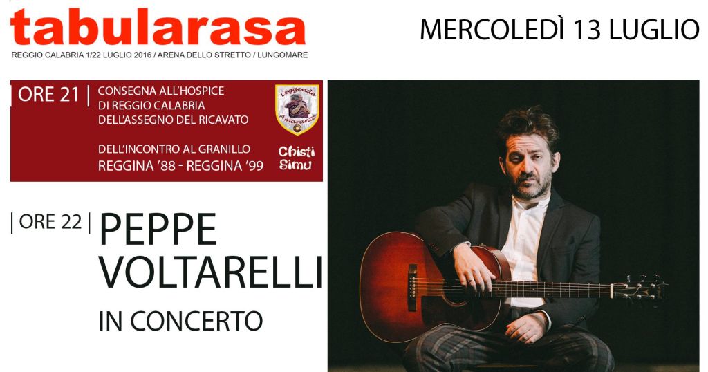 REGGIO CALABRIA – Dopo i successi delle scorse serate, Tabularasa continua questa sera, mercoledì 13 luglio, con altri due importanti eventi. Nello splendido scenario dell’Arena dello Stretto del Lungomare di Reggio Calabria, alle ore 21, le associazioni “Leggende Amaranto” e “Chisti Simu” consegneranno alla Fondazione Hospice l’assegno con il ricavato dell’incontro tenuto allo stadio “Granillo” tra Reggina ’88 – Reggina ’99, con l’addio al calcio di Belardi e Cirillo. Alle ore 22 sarà la volta di un grande artista calabrese, Peppe Voltarelli in concerto.
