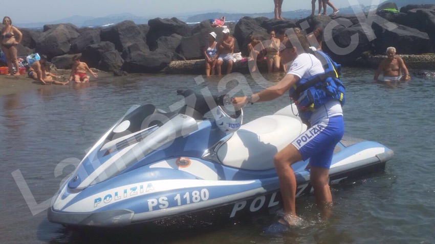 ISCHIA (NA) – Blitz della Polizia questa mattina nel Comune di Ischia. Tutto il lungomare che dalla Spiaggia dei Pescatori porta sino all’Hotel Mira Mare e Castello è stato controllato a tappeto dalle forze dell’ordine. Dal mare sono arrivati gli Acqua scooter e un elicottero, mentre da terra le volanti e le moto della Polizia di Stato hanno fatto la loro comparsa sulla sabbia rovente con gli agenti in borghese che con garbo hanno iniziato i controlli, necessari ad identificare eventuali presenze non gradite, tra i bagnanti. L’operazione alla vigilia di Ferragosto per controlli di routine ma soprattutto per offrire sicurezza alle migliaia di persone che in questi giorni sono in visita sull’isola verde, mira non solo a ripulire le spiagge da eventuali pregiudicati in libera uscita in barba al divieto di soggiorno ma anche a prevenire l’eventuale presenza di spacciatori che in vista del Ferragosto si rendono maggiormente presenti tra i giovani. Dopo un primo momento di smarrimento e preoccupazione tra i bagnanti e mentre gli agenti controllavano alcuni tra i presenti, i bambini in particolare si sono portati presso gli agenti simpatizzando con gli stessi e ammirando da vicino i mezzi in dotazione alle forze dell’ordine.