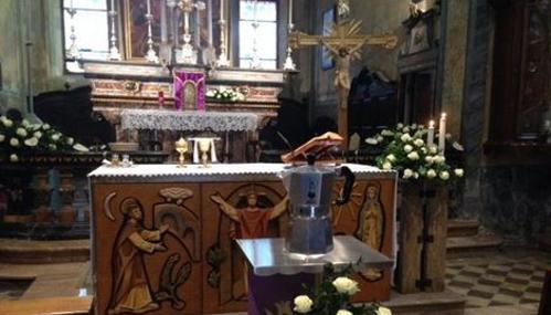 Omegna – Una Moka davanti all’altare, una di quelle con il classico «omino con i baffi» che dal Dopoguerra hanno fatto il giro del mondo. All’interno però non c’erano miscele di caffè, ma le ceneri di colui che quelle caffettiere le ha fatte conoscere in ogni angolo del pianeta. È con un gesto altamente simbolo che oggi pomeriggio a Casale Corte Cerro è stato celebrato il funerale di Renato Bialetti, una figura legata in modo indissolubile a quella della Moka. Proprio alla sua caricatura si rifà l’omino coi baffi, una geniale idea di marketing degli Anni 50, celebrata anche da Carosello.