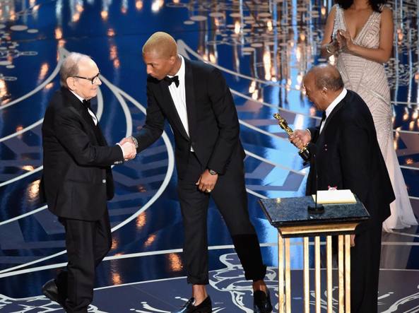 Arrivato a Los Angeles in veste di favorito, applauditissimo alla cerimonia per la stella sulla Walk of Fame di Hollywood, Ennio Morricone ha vinto l’Oscar per la colonna sonora di The Hateful Eight di Tarantino consegnato dal grande Quincy Jones. Era la sesta candidatura, non ce l’aveva fatta per I giorni del cielo, Mission, Gli intoccabili, Bugsy e Malena. Finora, a 87 anni, aveva ricevuto la statuetta per la carriera dalle mani di Clint Eastwood (nel 2007). La vittoria ai Golden Globes aveva confermato che questo sarebbe stato l’anno giusto. E, giustamente, scatta la meritata è commossa standing ovation. Lui ringrazia, ancor più commosso, in italiano: «Buonasera signori», rende omaggio agli altri compositori, in particolare a John Williams, autore della colonna sonora di Star Wars The Force Awakens, John Williams, «non c’è una musica importate senza un grande film che lo ispirino. Ringrazio Tarantino per avermi scelto. Dedico questo premio a mia moglie Maria».