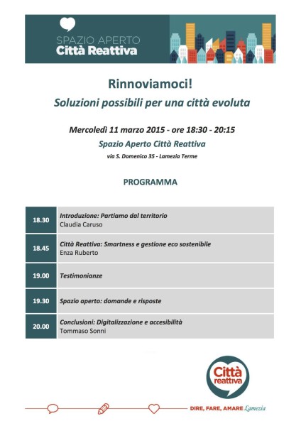LAMEZIA TERME (CZ) – Si terrà mercoledì 11 marzo alle 18.30, presso lo Spazio Aperto di Città Reattiva, un dibattito per parlare dell’accessibilità alla rete, la digitalizzazione e le nuove tecnologie dal titolo “Rinnoviamoci! Soluzioni possibili per una città evoluta”.