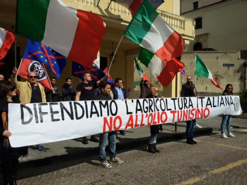 Azione shock di CasaPound contro olio tunisino: “UE e PD nemici della nazione. Via la bandiera dai palazzi comunali”