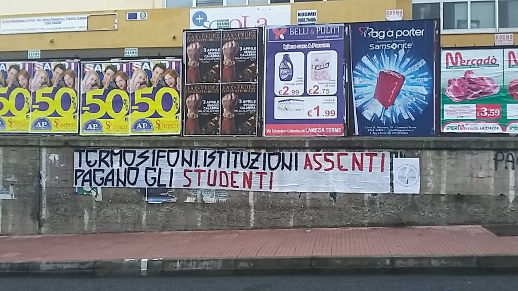 LAMEZIA TERME (CATANZARO) – “Termosifoni. Istituzioni assenti, pagano gli studenti”. Sono queste le dure parole dello striscione affisso nella notte dai militanti del Blocco Studentesco Lamezia Terme, espressione giovanile di CasaPound, all’entrata dell’Istituto Professionale di Via Leonardo Da Vinci.