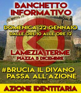 LAMEZIA TERME (CATANZARO) – Domenica 22 gennaio dalle ore 10 alle ore 12, dirigenti e militanti di Azione Identitaria, in Piazza 5 dicembre a Lamezia Terme incontreranno i cittadini, distribuendo materiale informativo circa le linee politiche relative al Manifesto programmatico ed ideale del movimento politico.