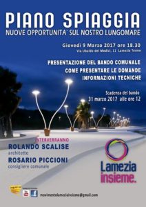 LAMEZIA TERME (CATANZARO) – Il Piano Spiaggia comunale e le nuove opportunità di sviluppo del litorale lametino saranno al centro dell’incontro pubblico promosso dal consigliere comunale di “Lamezia Insieme” Rosario Piccioni in programma giovedì prossimo 9 marzo a partire dalle 18.30 in Via Ubaldo De Medici 11. Scopo dell’incontro, con il contributo tecnico dell’architetto Rolando Scalise, sarà quello di offrire informazioni operative a quanti vogliono partecipare al bando comunale per la concessione delle aree demaniali marittime, in scadenza il prossimo 31 marzo, e confrontarsi sulle prospettive di crescita turistica legate al Piano Spiaggia.