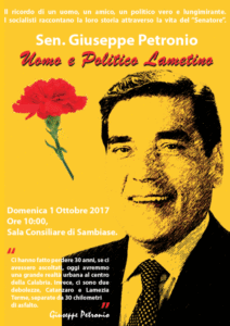 LAMEZIA TERME (CATANZARO) – Si terrà domenica mattina, presso la sala consiliare dell’ex comune di Sambiase, dalle ore 10 alle 13, l’evento in ricordo del Senatore Giuseppe Petronio, “uomo e politico lametino” scomparso nel maggio scorso.