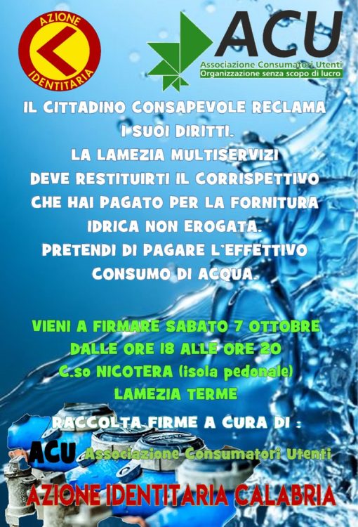 “L’Associazione Consumatori Utenti, ACU-Calabria, ed Azione Identitaria, ciascuno nel rispetto dei propri scopi sociali, ma entrambe nel primario interesse dei diritti del cittadino, hanno organizzato una raccolta di firme finalizzata all’invio di una diffida alla LAMEZIA MULTISERVIZI affinchè provveda immediatamente al rimborso, in favore di tutti i cittadini titolari di utenza idrica, di quanto pagato per la fornitura dell’acqua non erogata a causa di interruzioni.
